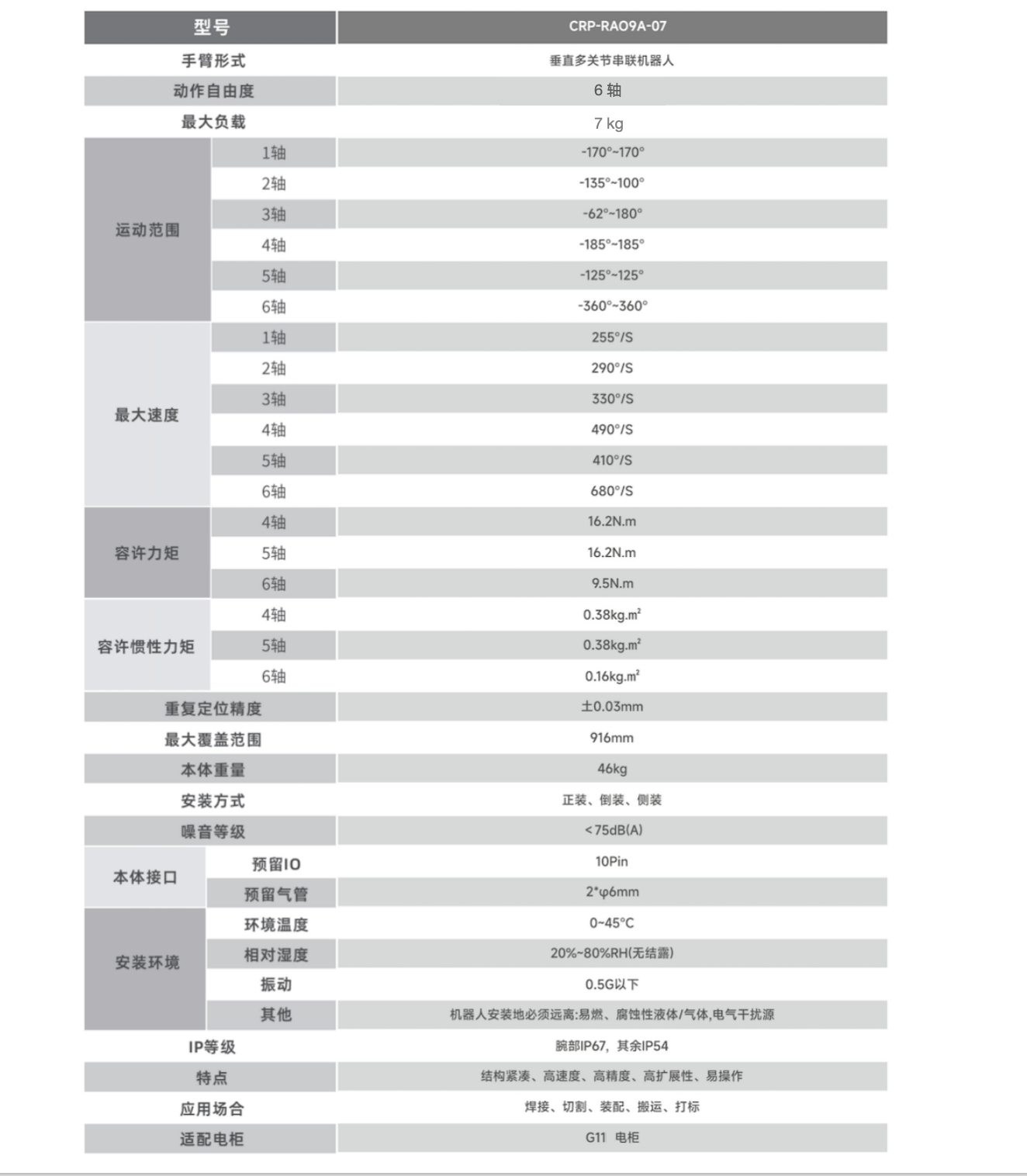 • 臂长916mm,手腕负载容量大,额定负载7kg,可轻松应对多种应用场合。