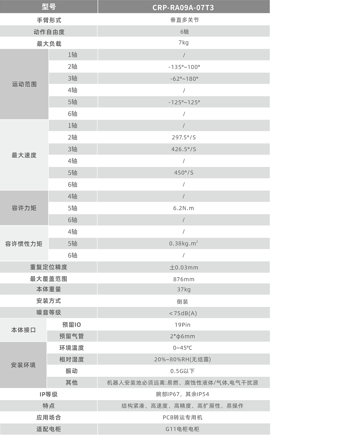 CRP-RA09A-07T3主要针对PCB板行业生产应用定制开发,应用PCB板行业上下料工序,且为更好适应PCB行业市场,所推出轻巧、应用简单、高速、成本更低的机器人,以满足客户对机器人的需求。